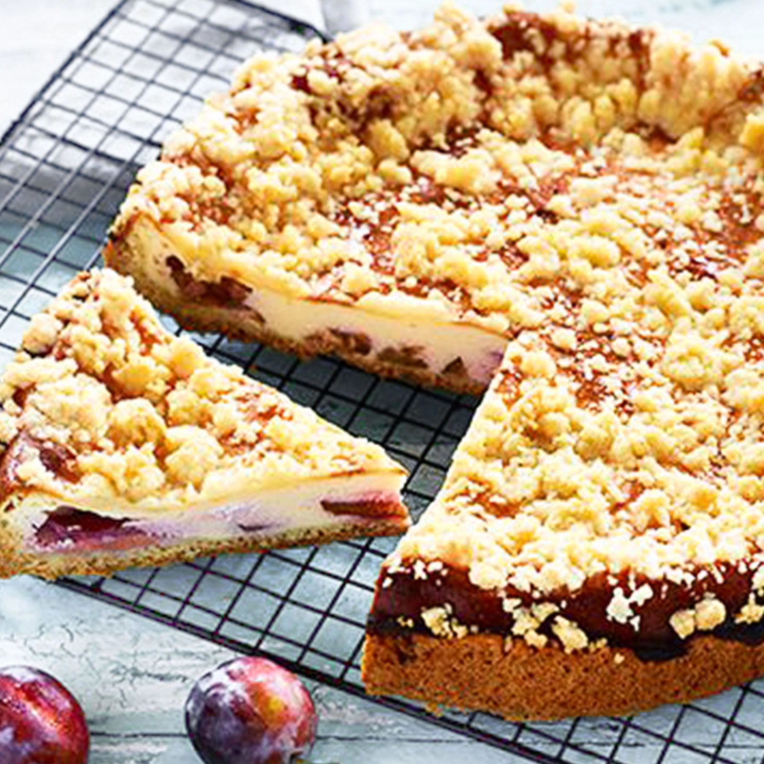 Mit cremiger quarkfüllung, buttrigem mürbeteig und knusprigen streusel .